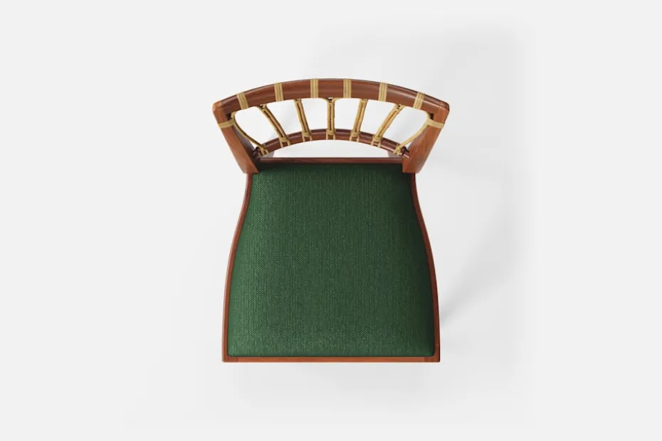 Stol 1165 har en genombruten rygg bestående av lindad rotting. För att skapa en spänning i formen valde Josef Frank ofta att blanda olika träslag och material. Stol 1165 formgavs av Josef Frank 1947.