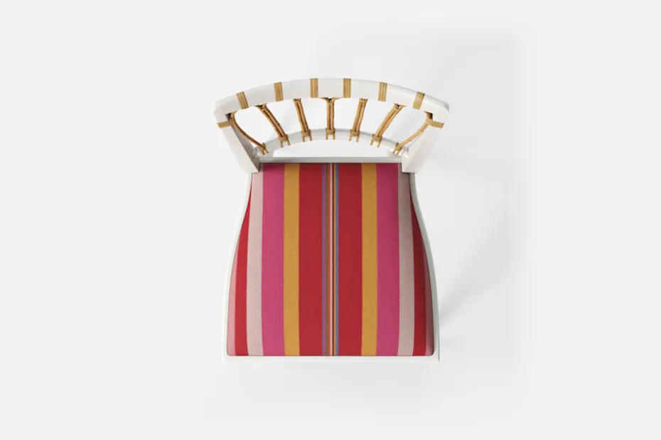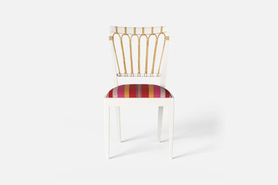 Stol 1165 har en genombruten rygg bestående av lindad rotting. För att skapa en spänning i formen valde Josef Frank ofta att blanda olika träslag och material. Stol 1165 formgavs av Josef Frank 1947.