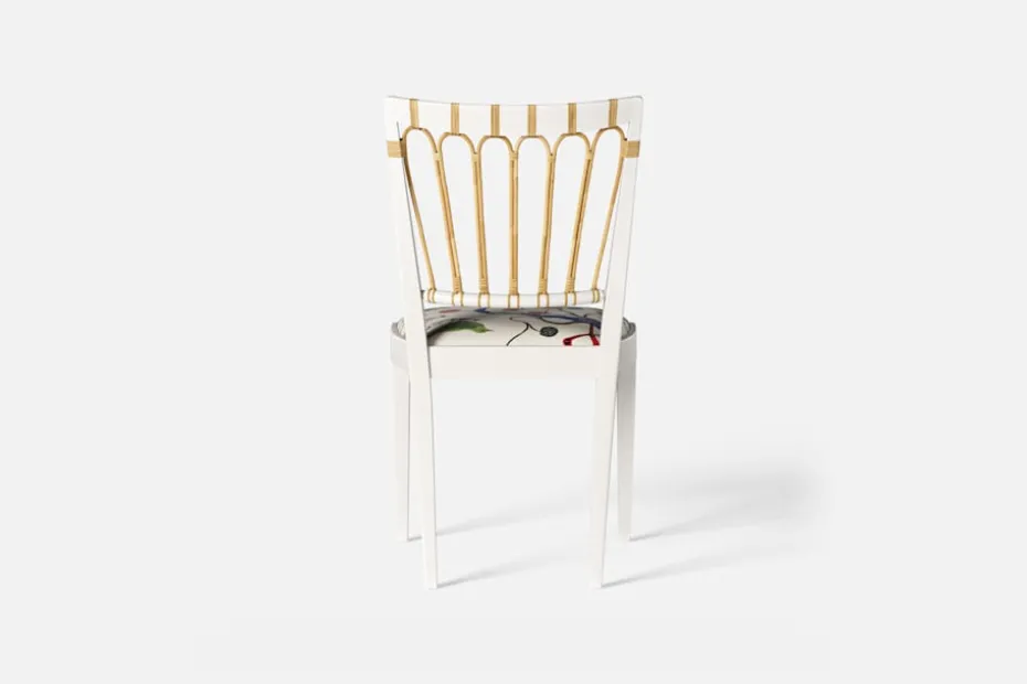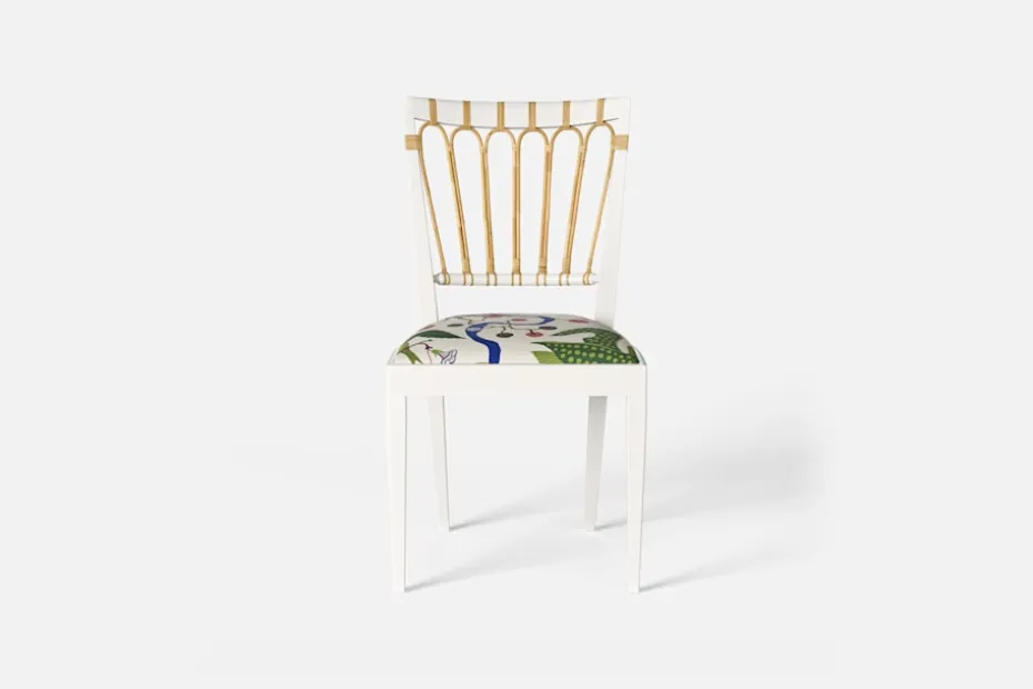 Stol 1165 har en genombruten rygg bestående av lindad rotting. För att skapa en spänning i formen valde Josef Frank ofta att blanda olika träslag och material. Stol 1165 formgavs av Josef Frank 1947.