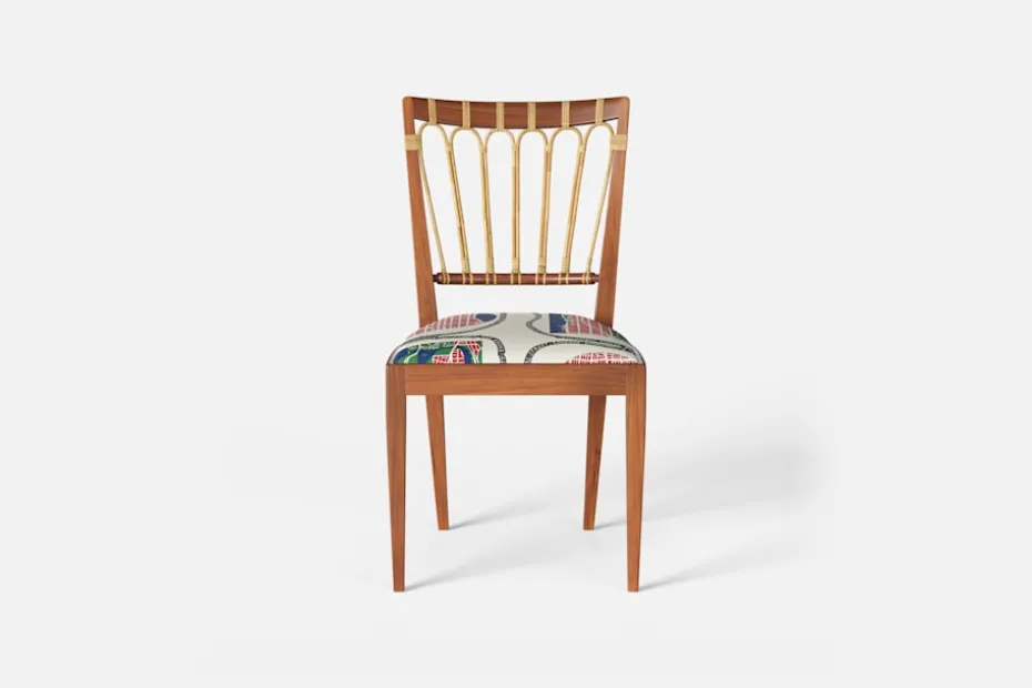 Stol 1165 har en genombruten rygg bestående av lindad rotting. För att skapa en spänning i formen valde Josef Frank ofta att blanda olika träslag och material. Stol 1165 formgavs av Josef Frank 1947.