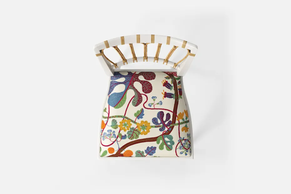 Stol 1165 har en genombruten rygg bestående av lindad rotting. För att skapa en spänning i formen valde Josef Frank ofta att blanda olika träslag och material. Stol 1165 formgavs av Josef Frank 1947.
