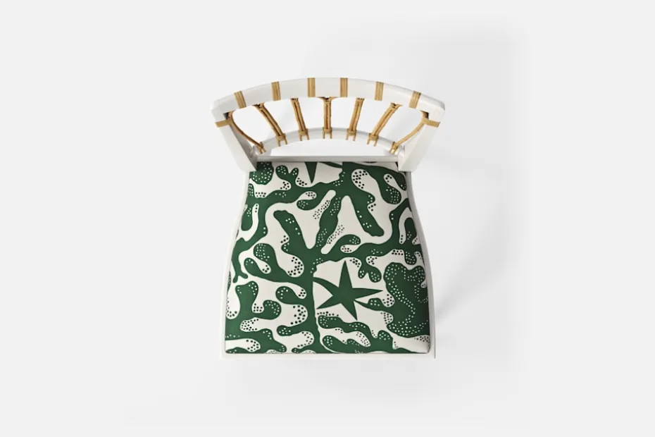 Stol 1165 har en genombruten rygg bestående av lindad rotting. För att skapa en spänning i formen valde Josef Frank ofta att blanda olika träslag och material. Stol 1165 formgavs av Josef Frank 1947.