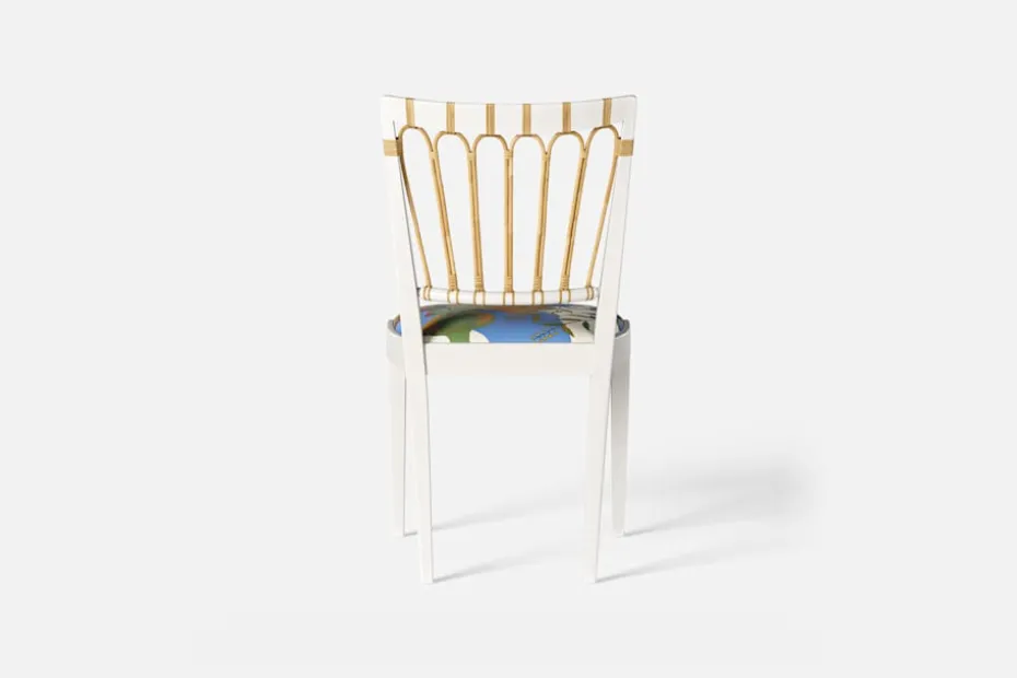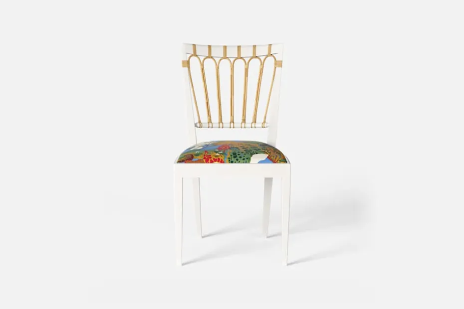 Stol 1165 har en genombruten rygg bestående av lindad rotting. För att skapa en spänning i formen valde Josef Frank ofta att blanda olika träslag och material. Stol 1165 formgavs av Josef Frank 1947.