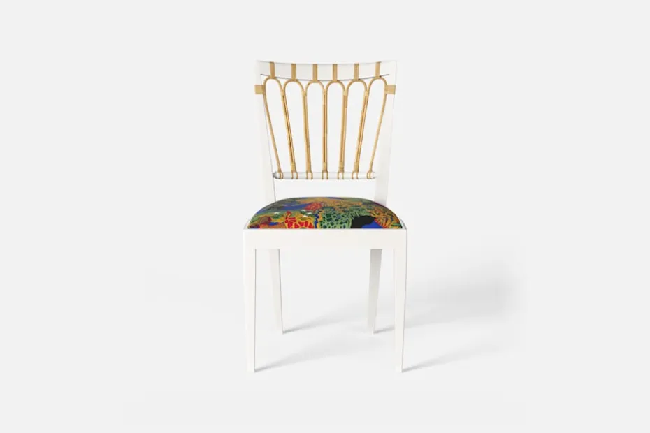 Stol 1165 har en genombruten rygg bestående av lindad rotting. För att skapa en spänning i formen valde Josef Frank ofta att blanda olika träslag och material. Stol 1165 formgavs av Josef Frank 1947.