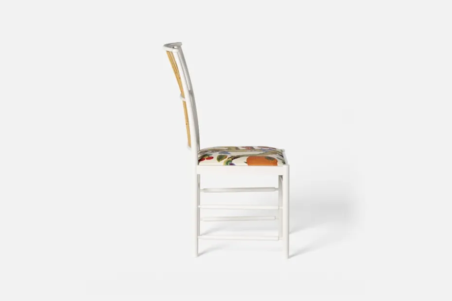 Josef Frank ansåg att en matsalsstol skall vara så lätt att den kan lyftas med ett finger och att användaren lätt bör kunna flytta stolen i rummet. Han formgav denna gracila stol år 1925 för sitt företag Haus und Garten i Wien. För att skapa spänning i formen valde Josef Frank ofta att blanda olika träslag och material, så även i denna klassiska stol.
