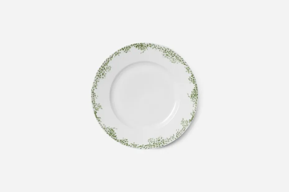 Tallrik Myrten är formgiven av Signe Persson-Melin som en komplettering till teservisen i tenn som hon formgav för Svenskt Tenn 2004. Det fina, sirliga myrtenmönstret smyckar flera produkter till det dukade bordet. Det är en gammal tradition att binda brudkronor av myrtens gröna blad, och växten är starkt förknippad med kärlek.