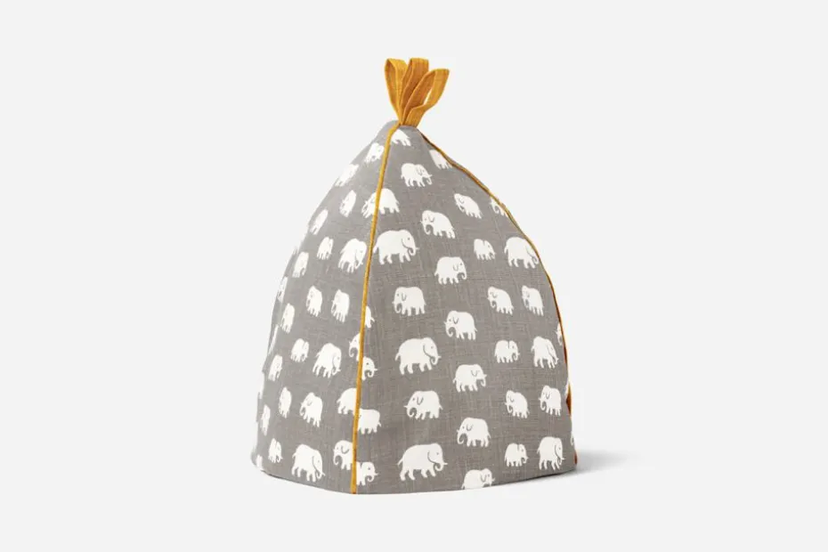 Svenskt Tenns tehuva med mönstret Elefant, dekorerar varje kök eller dukning. Den runda huvan håller tekannan, brödkorgen eller frukostäggen varma. Svenskt Tenns grundare Estrid Ericson reste mycket till olika platser runt om i världen. Hon letade alltid efter vackra föremål, textilier och souvenirer att ta hem och sälja i butiken på Strandvägen. Det var efter en förlaga från Belgiska Kongo som hon formgav mönstret med de små elefanterna. Svenskt Tenn tryckte textil Elefant för första gången i slutet av 1930-talet.