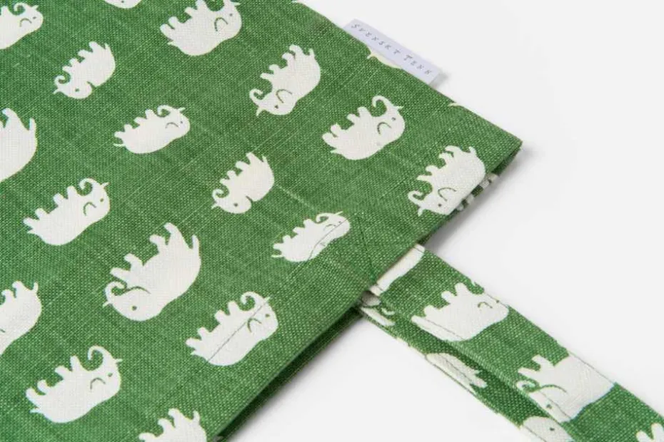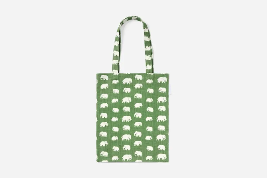En mjuk tygkasse med Svenskt Tenns klassiska elefantmönster, formgivet av Estrid Ericson på 1930-talet.