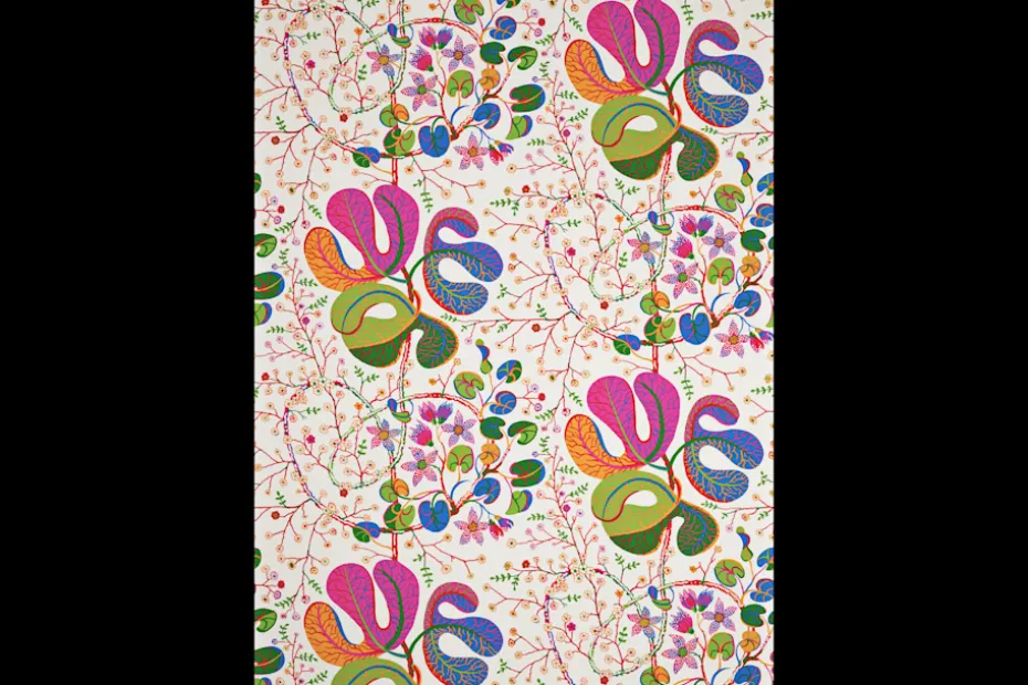 Namnet Teheran, liksom de små lysande småblommorna i fonden, tyder på att mönstret är en parafras över den persiska mattan. Det flikiga bladet i skiftande kulörer för tanken till växtfärgämnen som krapp, gulreseda och indigo. Teheran formgavs i början av 1940-talet men trycktes för första gången år 1991.