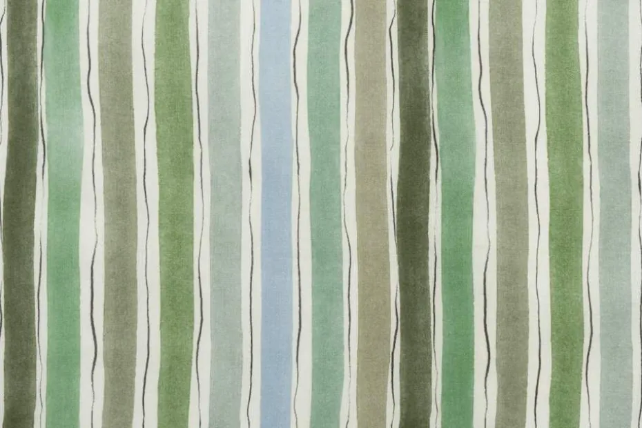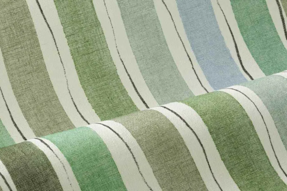 Textil Wisteria smyckas av målade ränder i blågröna toner, inspirerade av blommande blåregn i trädgården som omger Villa San Michele på Capri. Mönstret är formgivet av designern Lars Nilsson för Svenskt Tenn, och finns även i en annan färgställning vid namn Anacapri.