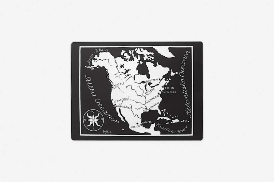 Underläggen med Josef Franks mönster Världskartan från 1939 föreställer en värld i fred, och kontinenter utan gränser mellan länderna. De sex olika underläggen bär motiv föreställandes Afrika, Amerika, Asien, Australien, Europa och Sydamerika.