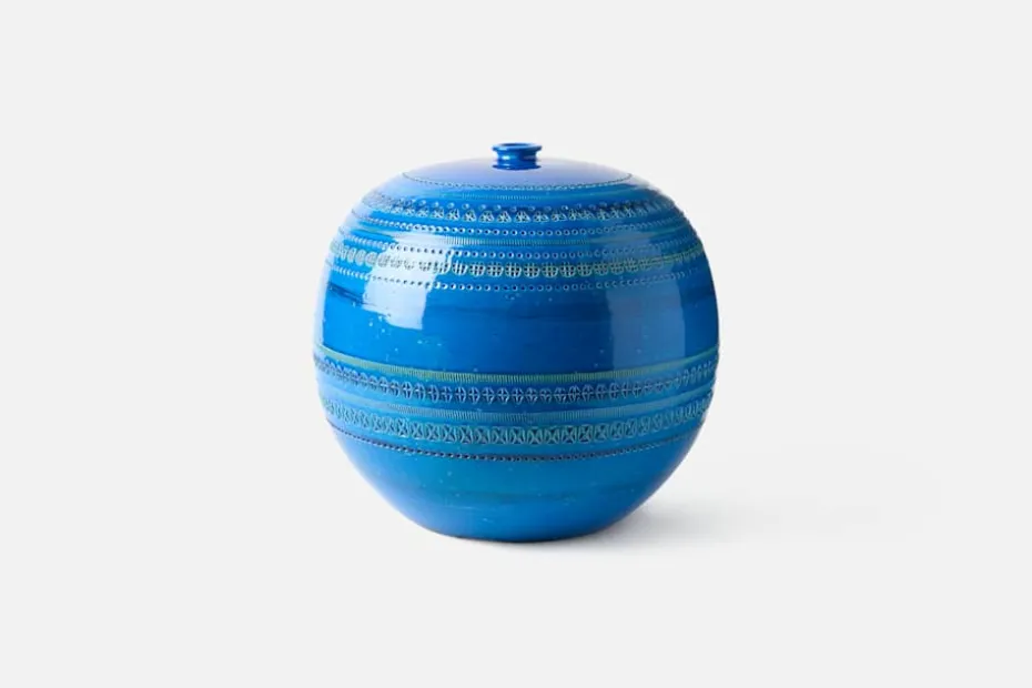 Rund, klotformad urna i keramik, formgiven av Aldo Londi för Italienska Bitossi, ett familjeägt företag som skapar unika och dekorativa föremål till hemmet och det dukade bordet. Urnan tillverkas hantverksmässigt i fabriken i Fiorentino, Toscana, och ger uttryck för en traditionell, italiensk design i samtida tappning. Den djupblå färgen för tankarna till medelhavet och bidrar med ett slående vackert uttryck i din inredning.