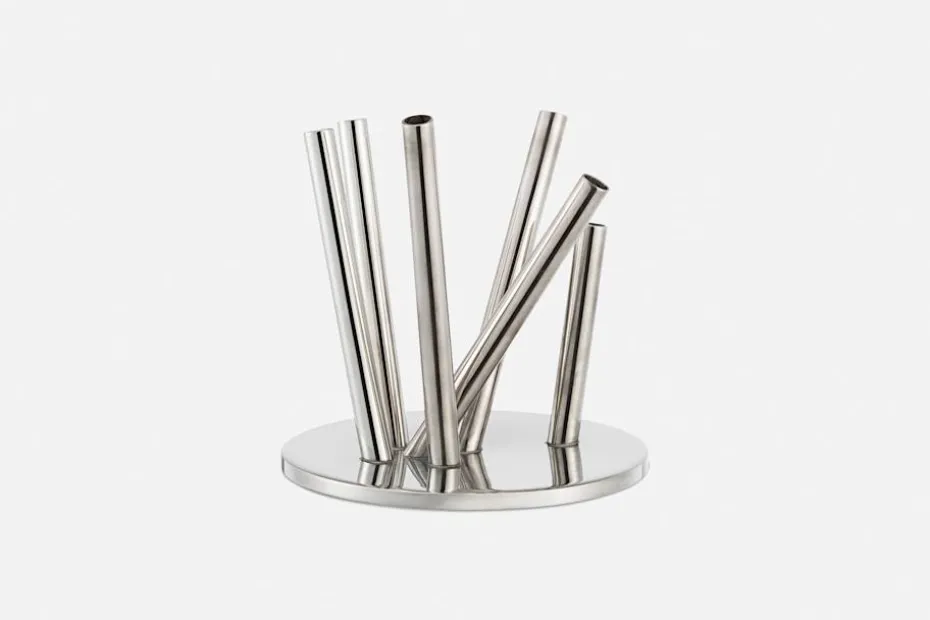 Med sina utstickande pipor sätter sig blommorna vackert i förhållande till varandra, vilket säkert var den tidiga funktionalistformgivaren Nils Fougstedts tanke när han formgav vasen i tenn. Uttrycket känns modernt trots att den formgavs redan 1931.