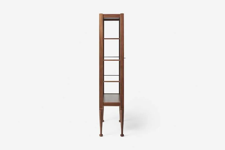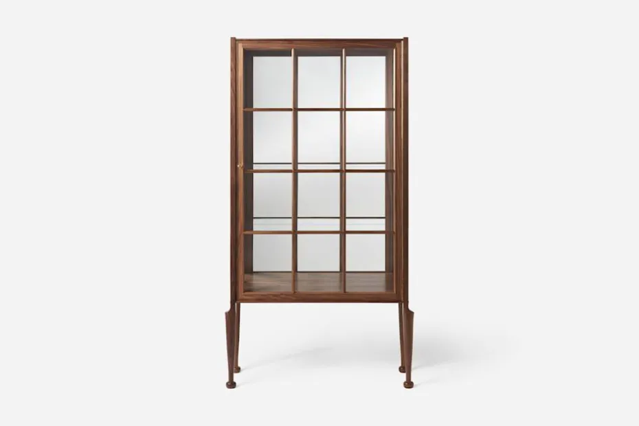 Ett stort vitrinskåp i valnöt och glas, formgivet av Josef Frank 1957. Denna vitrin, med cabriole-ben och så kallade ”klubbfötter”, är ett typiskt exempel på ett engelskt ”display cabinet” – perfekt för att visa upp vackra och spännande föremål i ett hem. Josef Frank ansåg att vitrinen gärna fick ingå i en modern inredning, och menade att föremålen som placeras i skåpet inte nödvändigtvis behöver vara av samma slag. Istället bör vackra saker blandas med nyttiga, så som man ju brukar göra i hemmet i övrigt.