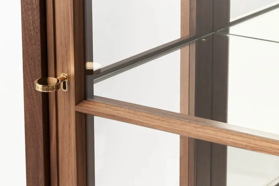 Vitrinskåp 2217 tillverkas hantverksmässigt av Tre Sekel Möbelsnickeri med en stomme i valnöt, fönster i glas och hyllor i spegelglas.